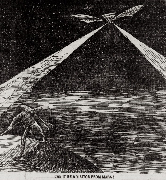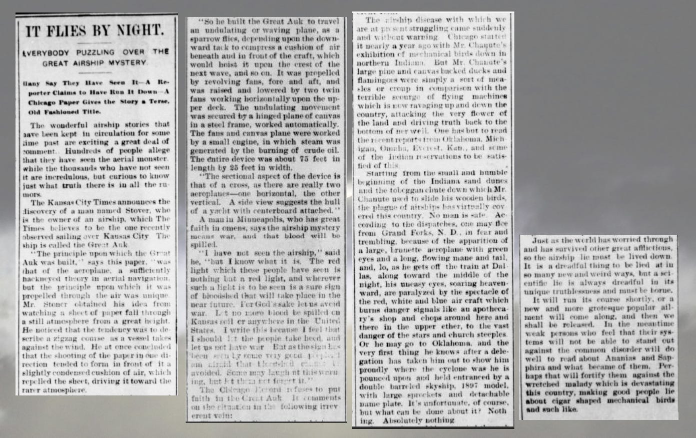 We don’t know the identity of the party or parties responsible for the Great Airship sightings of 1896-1897. And we don’t know the identity or identities of the parties responsible for the UFO reports from our day. The thing is, the thing made a dent on our consciousness of what is possible: heavier-than-air flight.