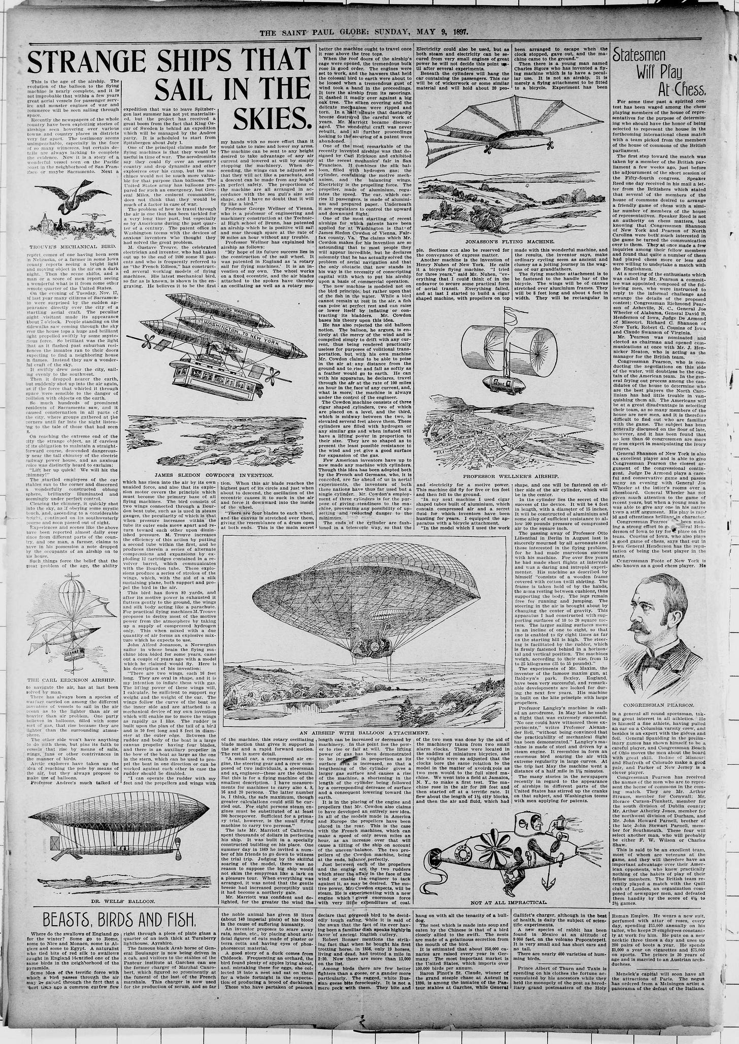 The St. Paul Globe published a spectacular Sunday feature on the subject of the Great Airship, “Strange Ships that Sail in the Skies,” on May 9, 1897. Readers also may enjoy the many illustrations of airships, balloons and dirigibles from before they became commonplace.