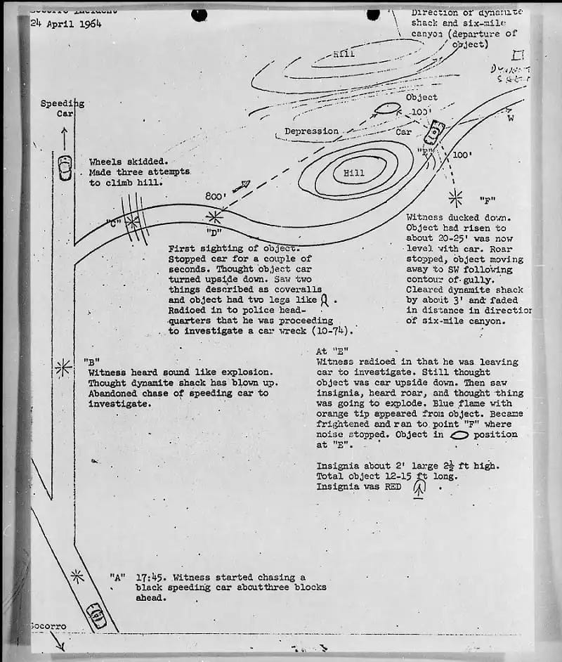 The following text and illustrations are what happened in Lonnie Zamora’s own words, recorded by investigators from the FBI and the United States Air Force, part of the case records preserved by the team at the Central Intelligence Agency: