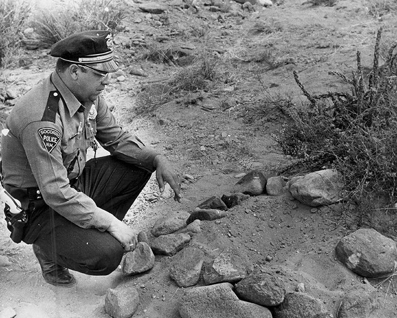 In those days, that part of Socorro was undeveloped and still explored by mining interests. Worried that a nearby dynamite shack had exploded, Sgt. Zamora dropped pursuit and turned down a rocky dirt road. His rear-wheel drive patrol car struggled to pull up a hill, but he kept trying. Reaching the top, he found a spot where the terrain allowed him a view toward the shack. He stopped for about two seconds to observe what he thought at first was a crashed car.
