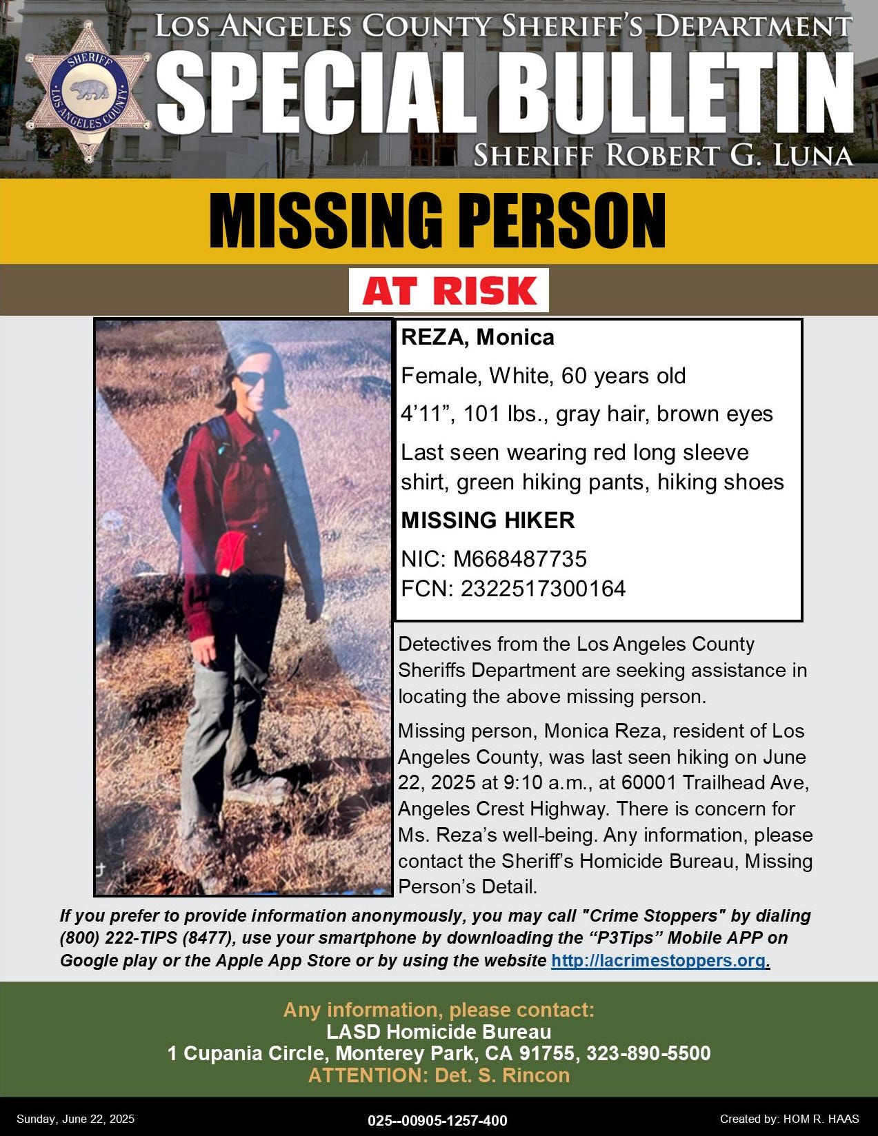 On June 22, 2025, Monica Jacinto Reza, 60, an aerospace engineer specializing in materials for rocket engines, disappeared while hiking with a friend in the Los Angeles National Forest. Ms. Reza had worked on a project directed by Dr. McCasland at Los Angeles Air Force Base.