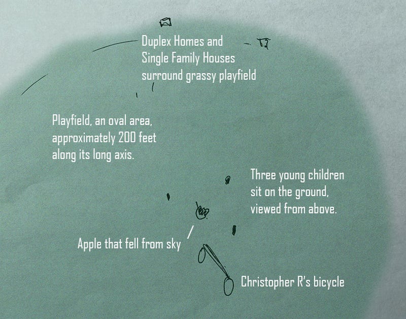 “All three of us noticed the abrupt change. But, before anyone could say anything, something dropped down from the sky. It landed on the grass, right between the three of us. It didn’t roll or move in. It just dropped straight down from above.