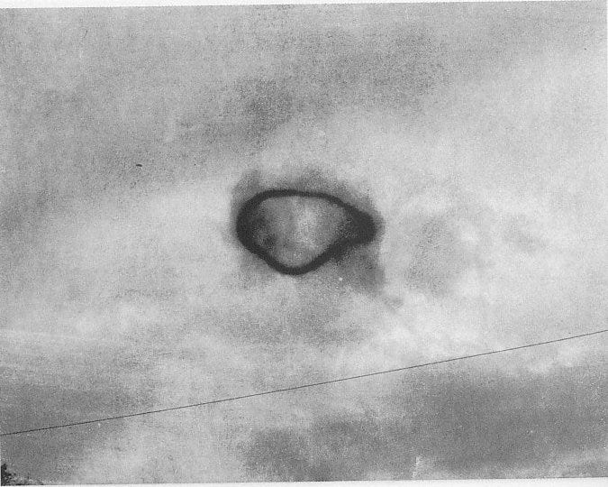 In addition to the photos, Heflin added his observations of the object in flight. The thing moved in a wobbly manner similar to a gyroscope slowed by friction. The wobble seemed to resolve as the object gained altitude. It then shot quickly to the north, leaving a smoke-ring about for times its diameter, dissipating as it rose in the sky.