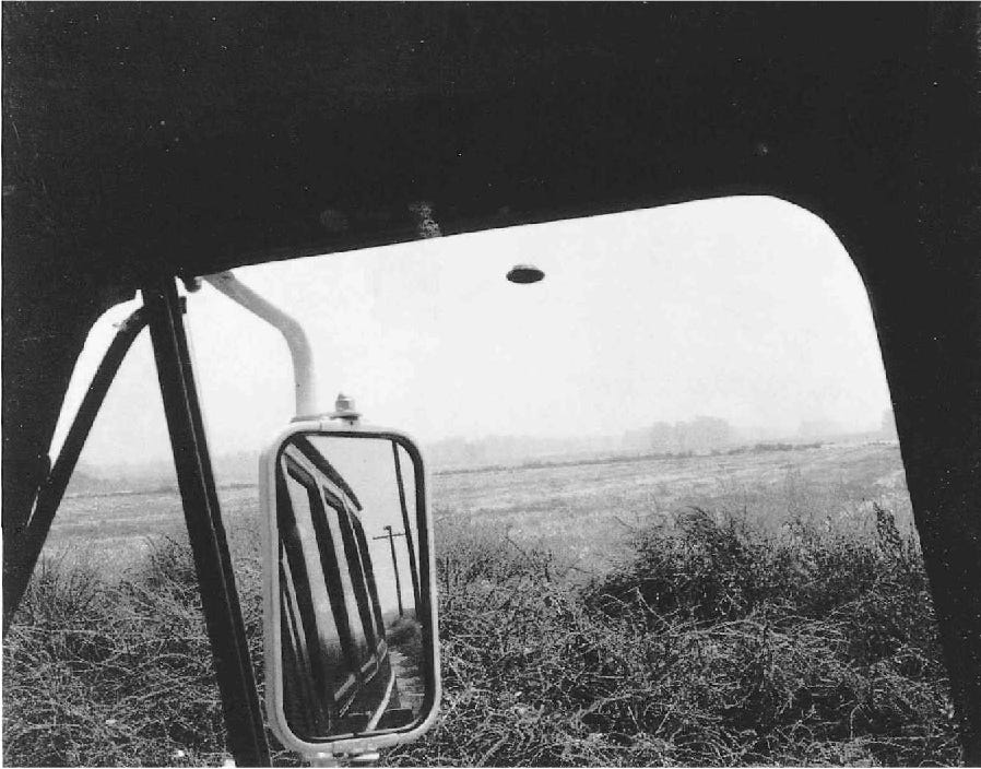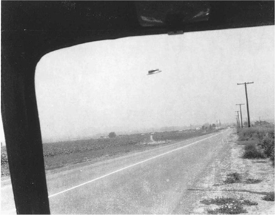 On the underside, a beam of light emanated from the center of the disk toward the rim, circling the bottom like the sweeping line on a radar screen. He estimated it went around every couple of seconds. Visible in Photograph 1 at the top of this article, a circle of dust stands up from the ground along the shoulder, indirectly underneath the object.